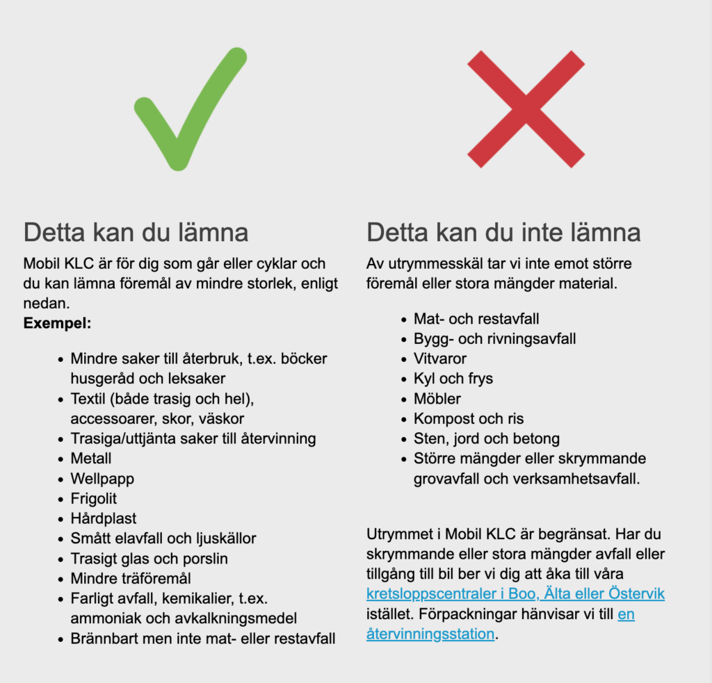 Om du har skrymmande eller större mängder material, eller tillgång till bil, rekommenderar vi dig att åka till någon av våra permanenta kretsloppscentraler i Boo, Älta eller Östervik istället. Förpackningar hänvisas till närmaste återvinningsstation.