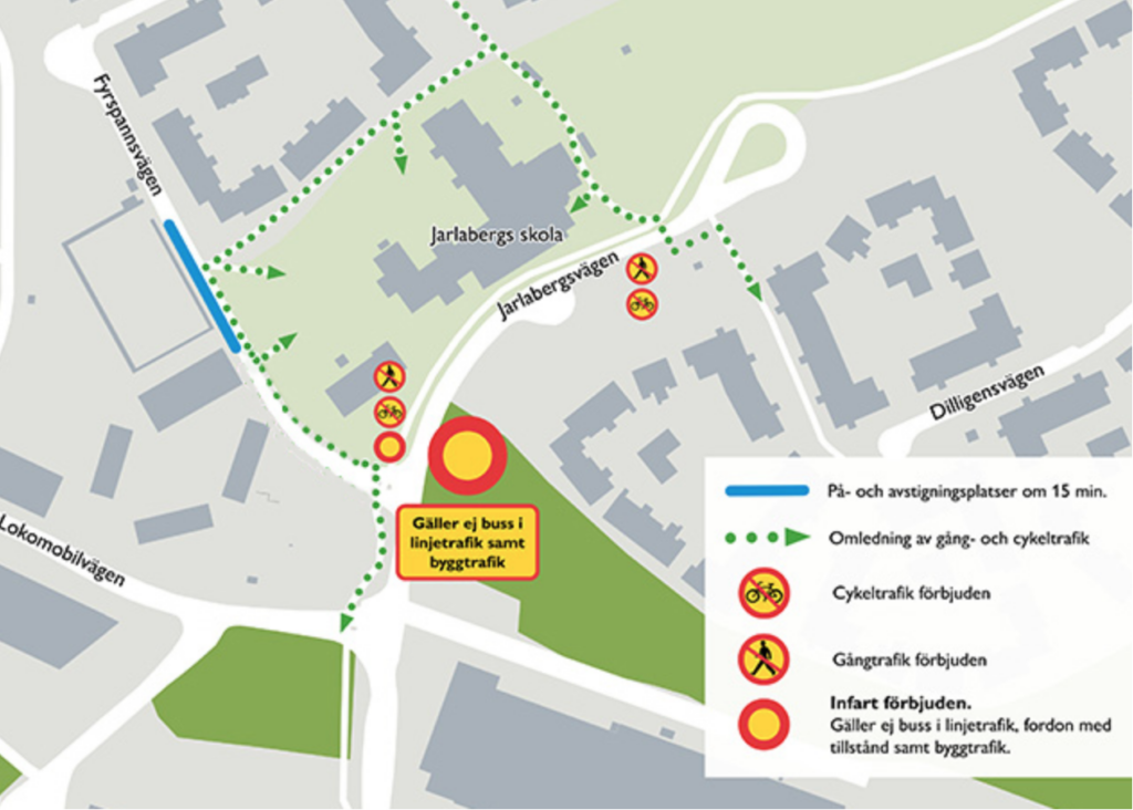 Under byggtiden är Jarlabergsvägen längs den aktuella sträckan avstängd för bil, gång och cykeltrafik.